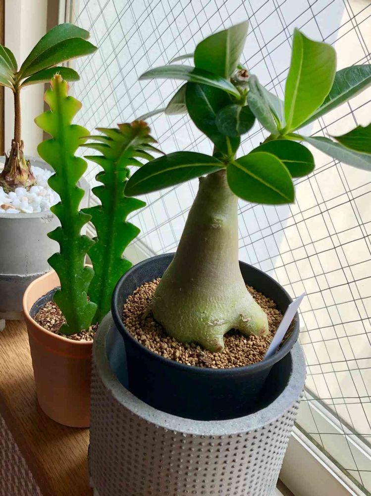アデニウムはたくさんいた中でこの子が唯一全体的にミドリンボディでした。樹形と色味が可愛くて連れて帰ってきたけど。。。病気でミドリンな訳じゃないよね?笑