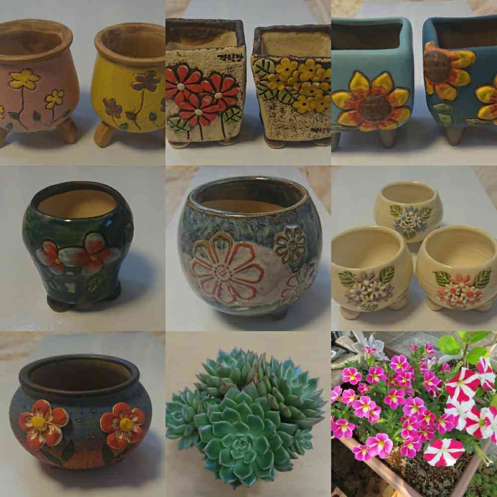 可愛い鉢に見とれてしまいます❣️特に右上ブルーにヒマワリ🌻可愛い💕