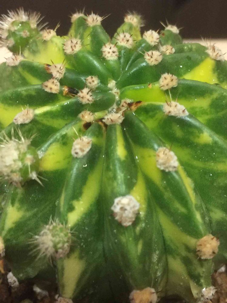 私、ダニもカイガラムシもまだ目撃したことがありません。見えていないだけかもしれませんので、成長点と陵の隙間をハブラシでゴシゴシやって水をかけ、シュッシュと殺菌しておきました😓