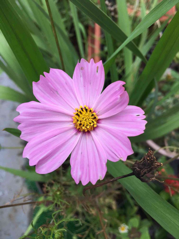 そうなんです、早々コスモス。種が周りのあちこちの鉢に飛んだようで小さめコスモスがあちこち^ - ^