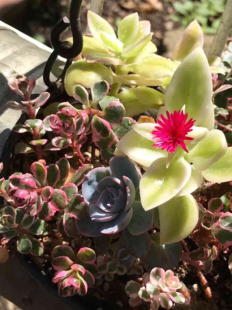 四月に寄せ植えたものは、赤くありませんでした。pic見る?そこから、東側の屋根下に下げてましたら、今現在は今日のpicの様になってます。別に寄せたものは、置く場所が違うのか、あんまりピンクじゃないけどね。😅