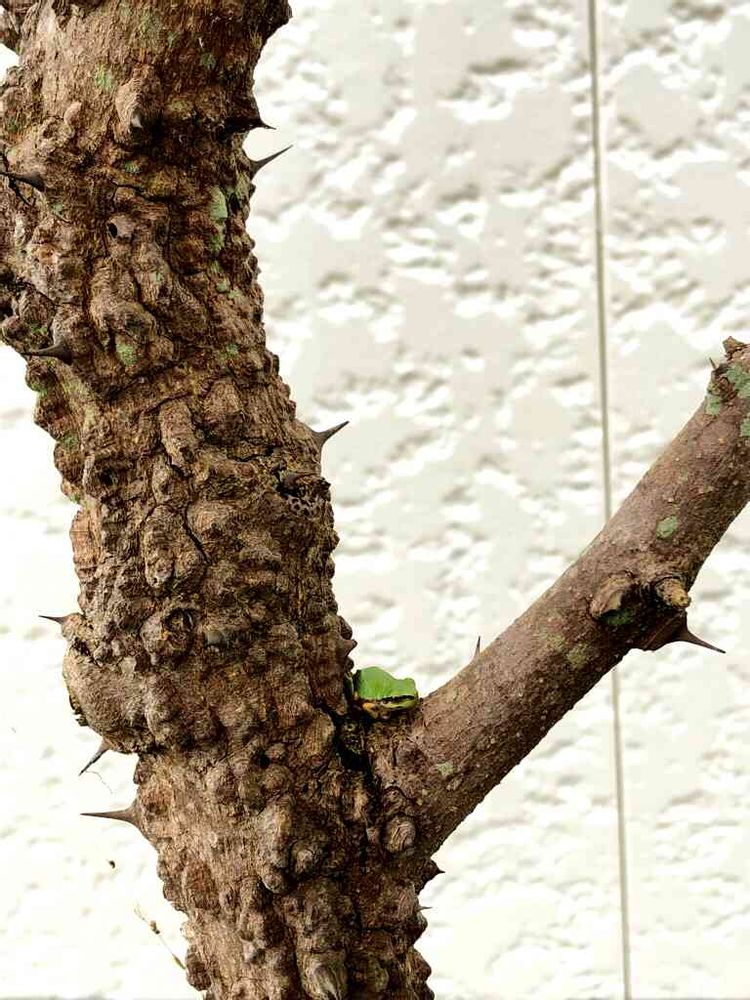 アマガエルの赤ちゃん、なぜにこんな危ない木に登る。