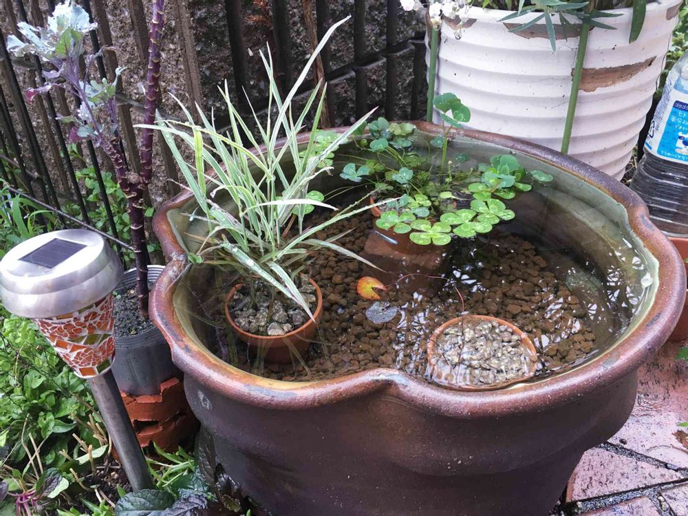 背中が光る青幹之(みゆき)メダカのために睡蓮鉢でビオトープもどきにチャレンジ。まだまだ寂しいですが、徐々に追加していこうかと思います