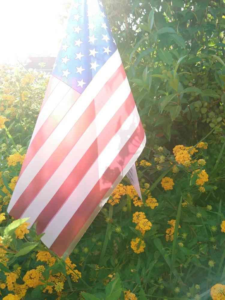 毎年、不動産屋さんが全てのお家の表庭に星条旗(pic)を、広告兼ねてプレゼントしてくれます。