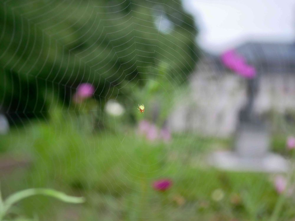 コスモスとコスモスの間に建設されていました。 丸っこいフォルムで、背中に平たく無地の黄緑の蓋を背負ったようなボディ・・ハナグモなのかよく判りませんが。