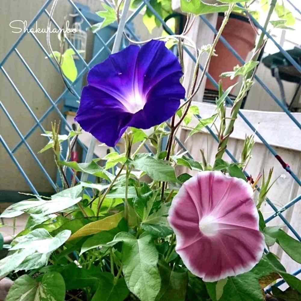 お洒落な色の朝顔が、ダブル開花なんておめでとう!(笑)