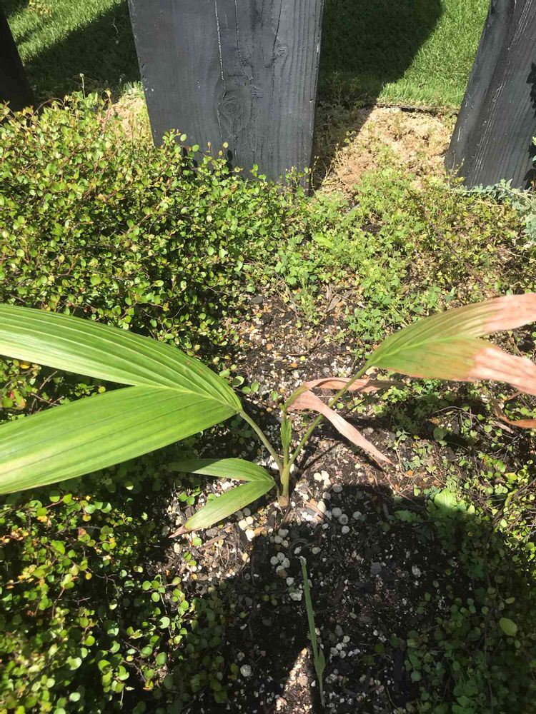 ダメ元で地植えしたイラワラキングパーム の小苗。地植えする前にあった子葉はすぐに葉焼けしたけど地植えしてから出てくる子葉は葉焼けしないです。