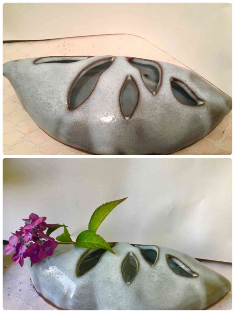 ちょい、変わった形の花器を作ってみました。それに小さな紫陽花を入れてみました