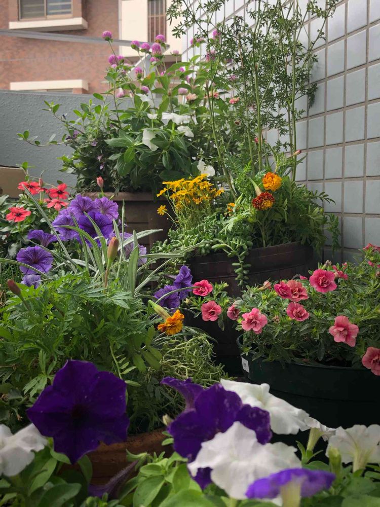 今朝のバルコニー。寄植えちょっと組替えしました。ざっと20種類ぐらい。もっと咲いてくれれば、もっと賑やかになるはず。楽しみです💕💕