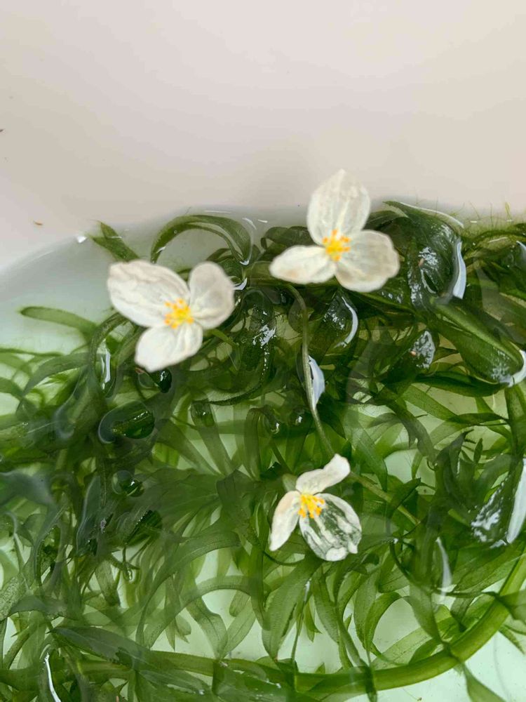 池の水草が増えたので、切って洗面器に入れておいたら 花が咲き始め ビックリ‼️
