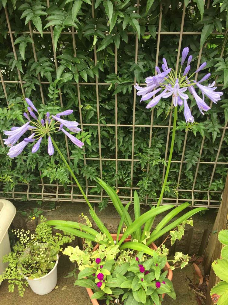 もともと背丈が高く寄せ植えが難しいようですが、きれいなブルー(紫色)は『万能カラー』で、小ぶりな品種のアガパンサスであれば、白・黄色・オレンジのアナベルやアキレスやヘメロカリス等がピッタリ、だそうです😄