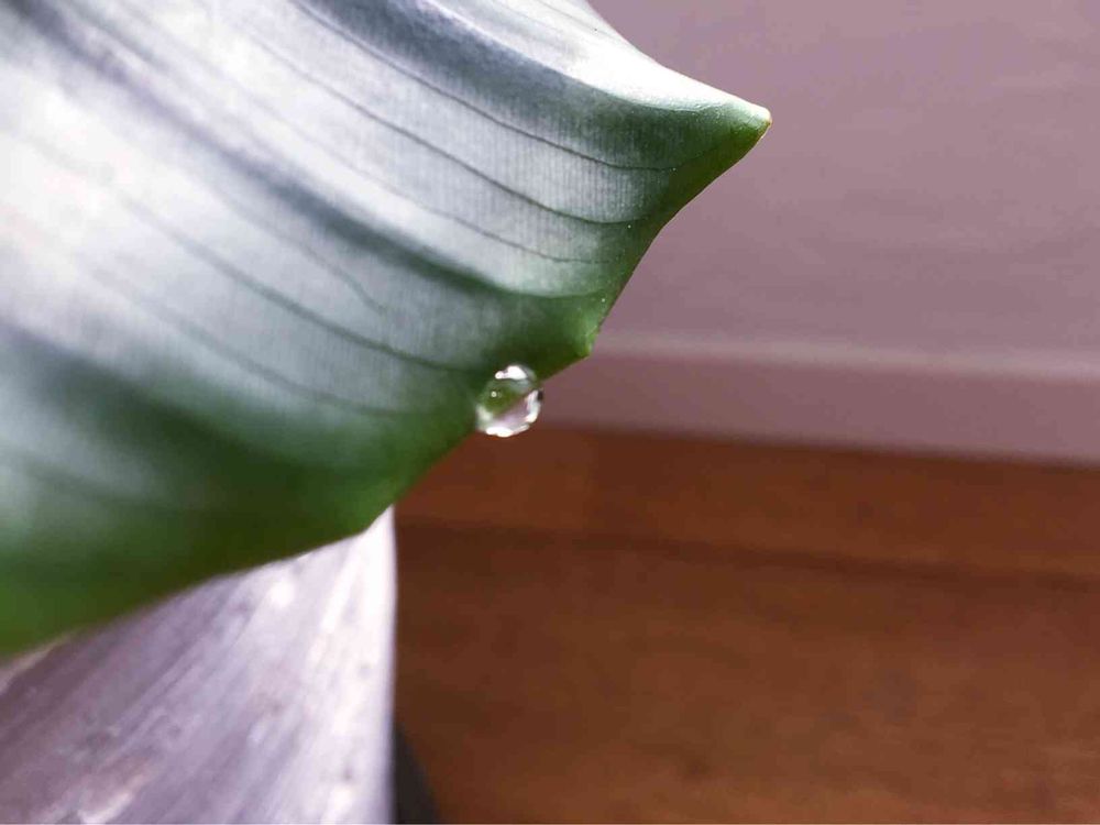 根から吸い上げた水分の過剰分が葉の先にある水孔から蒸散しきれず雫になります😄