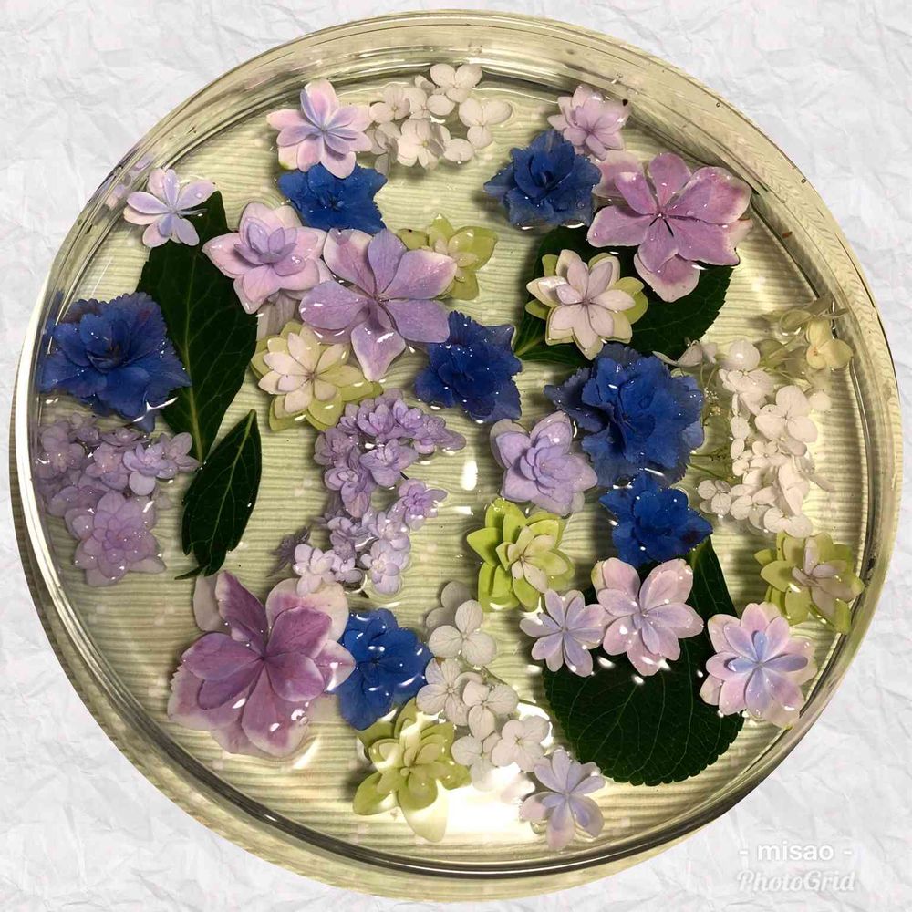 紫陽花はひと枝でもいろんな色や大きさがあるので、浮かべてみたら可愛かったです💕