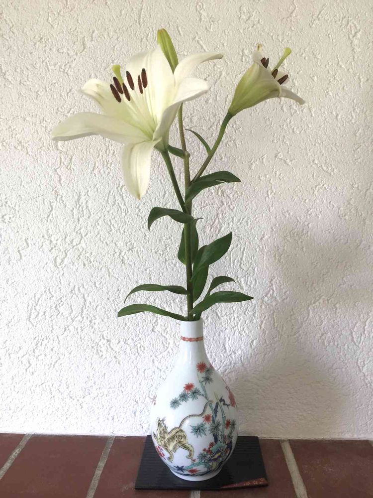 ウイスキーが入っていた有田焼の花瓶に百合をただ挿しました。この器、口が狭くて難しいんですが、案外こんな風に投げ入れてしまう方が、合うように思います。