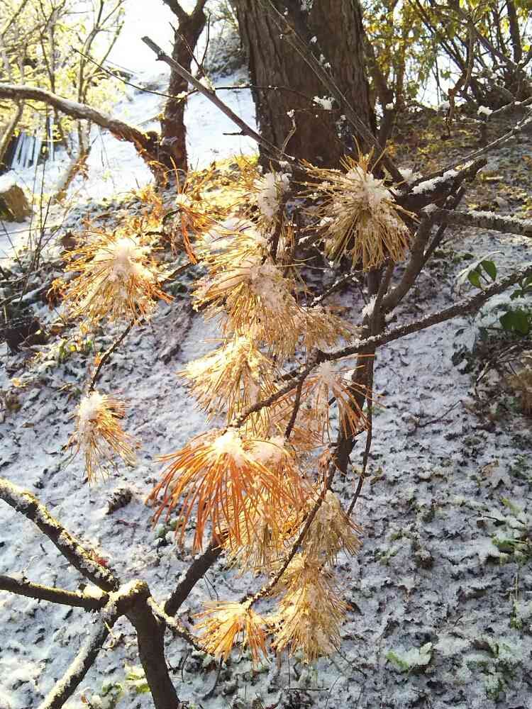 そう?まさにしばれた朝、松の葉は金粉をまぶした