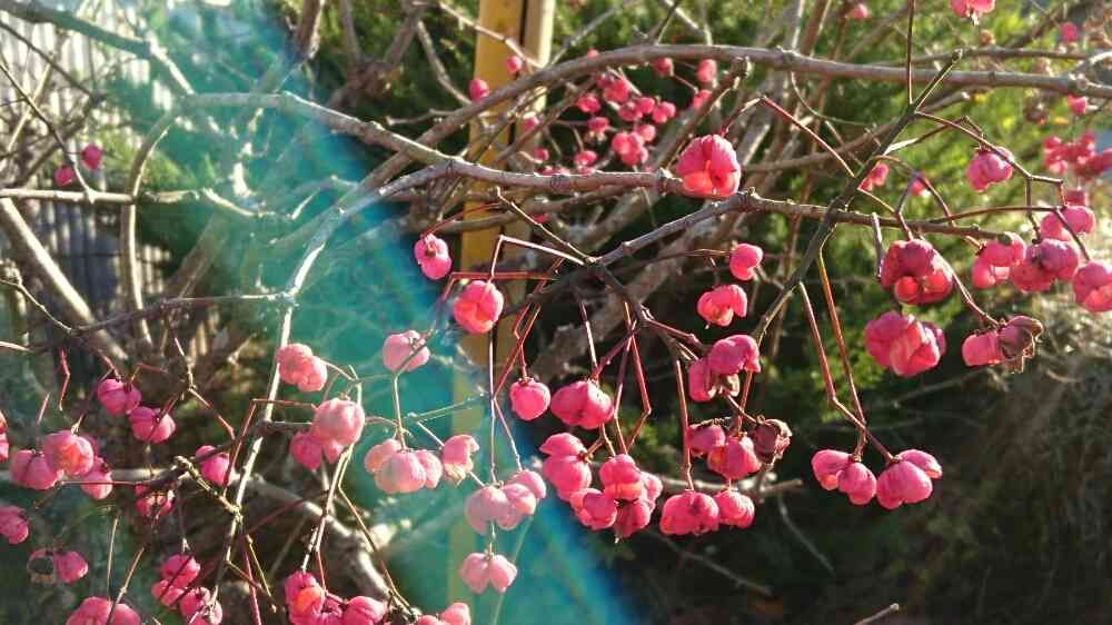 初夏に咲いた花が実を結び、熟した果実は4裂し、中から種子をのぞかせます。
