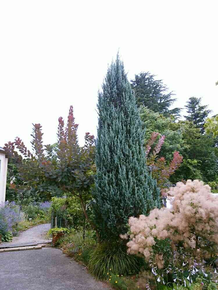 特に後ろの赤く大きいスモークツリーと青白いコニファーとの対比がたまりません