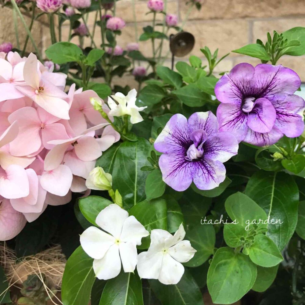 寄せ植えの紫陽花が少しずつ色変わりするとともに、ペチュニアの花数が少しずつ増えてきました🌸💜🌸