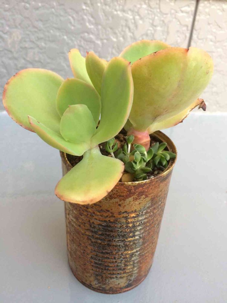 鉢はドックフードの空き缶を、1ヶ月くらい水につけて錆びを出し、底穴を空け、ニスと防水塗料で仕上げました(*^^*)