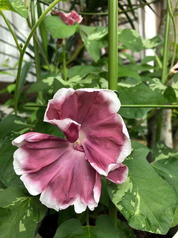大輪朝顔の「団十郎」が咲き始めましたが、雨に当たり過ぎてるからか、開くお花が破れていてなかなか円形に咲きません😢