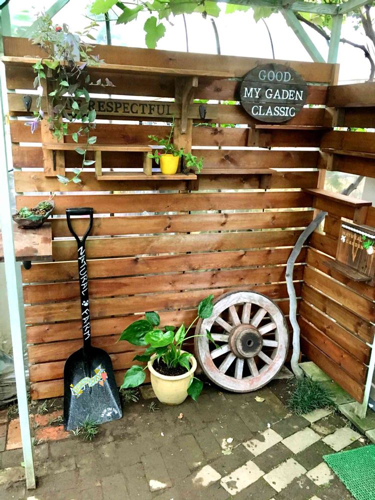 畑のガーデニングスペースの流し台を別の所に移しこんな棚ができましたよ😄✌️(夫DIY)