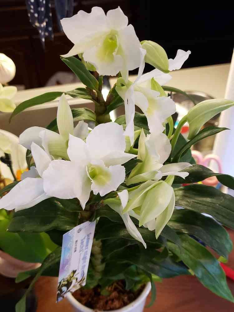 森水木のラン屋さんで注文させていただいた、サノ・オーキッドさんのサマーナイトドリームサチ(幸)が届きました。某家族の名前に幸という漢字が使われているので大切に育てたいなぁと。白とグリーンで爽やかな夏の花です。