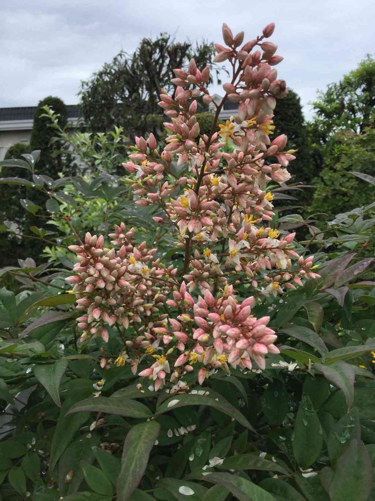 南天の花は白っぽいけど、蕾と開きかけはこんな色なのね🧐