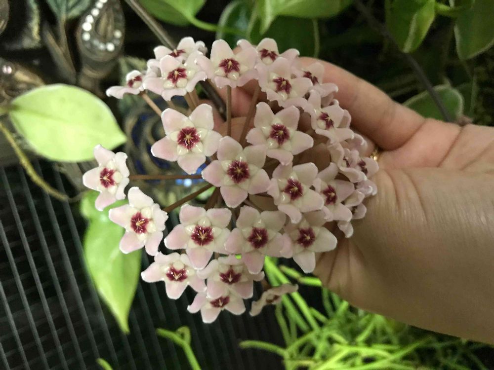 100均の観葉植物コーナーで3年前くらいに購入。今年初めて花が咲いたのですが種類がわかりません。蔓性の植物で葉は写真の上部に写っているものです。判る方がおられましたら宜しくお願い致します。