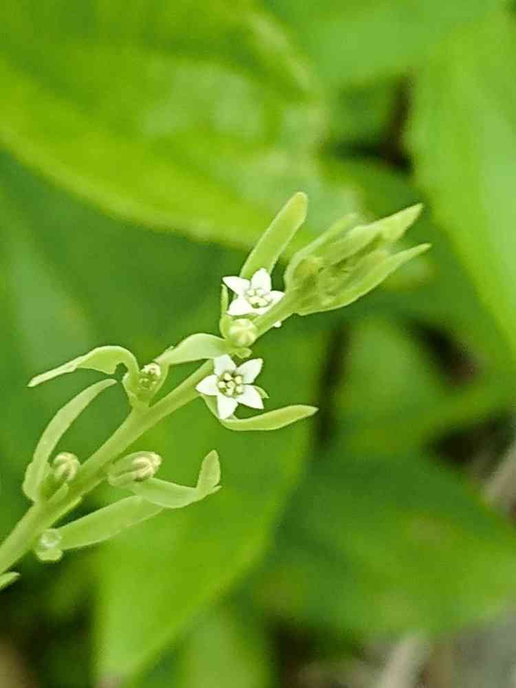 葉腋に外側が淡緑色、内側が白色の小さな花を1個ずつつける。花弁はなく萼裂片の先は4~5裂する。