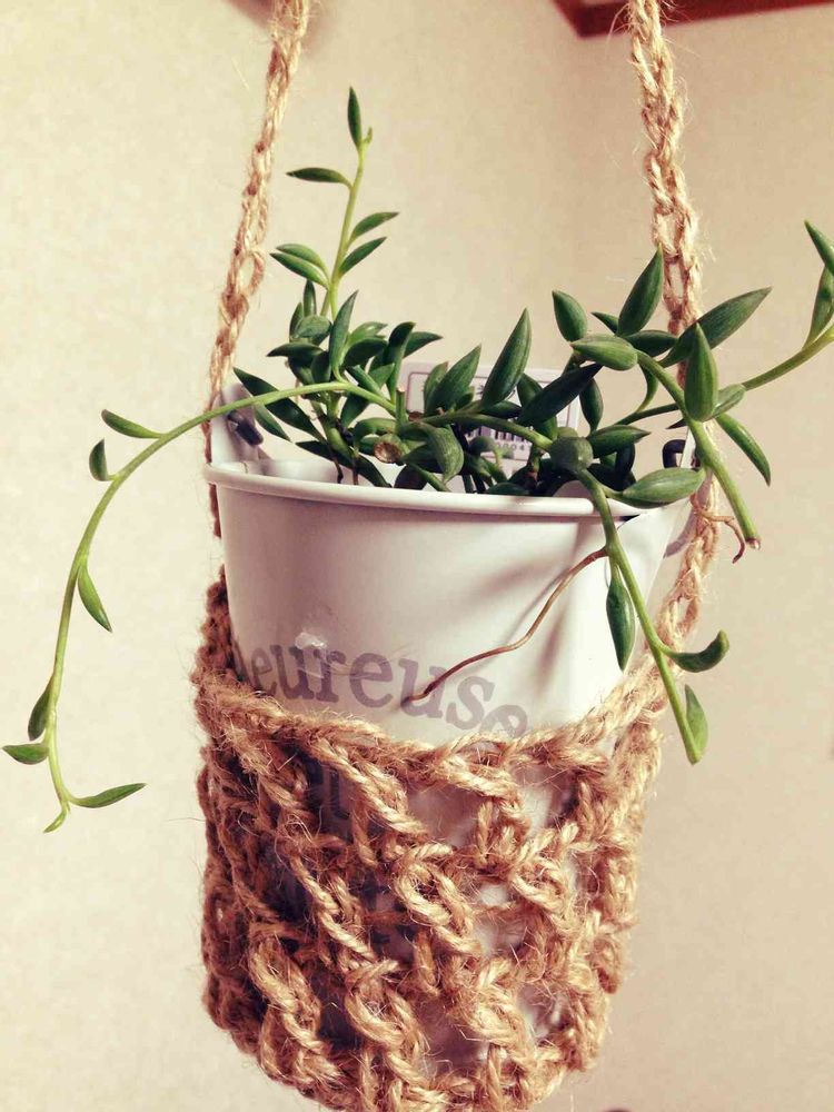 吊り下げたくて麻ひもでカゴを編んでみました( *´艸`)