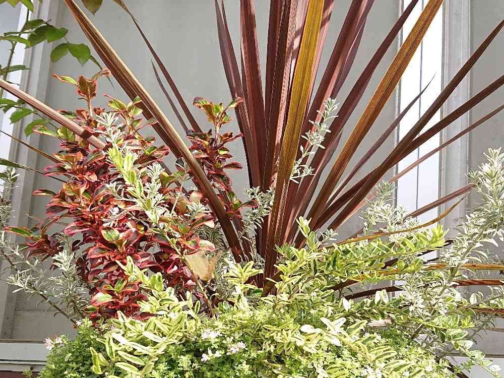 鉢の後ろ赤色のツンツン伸びた観葉植物?