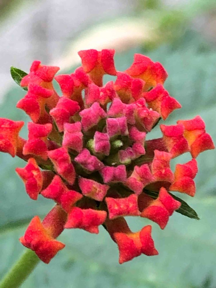 恥ずかしそうに、やっとつぼみをひろげ始めた、自宅の黄色からオレンジ・赤へと変化する、ランタナの花🌼💐