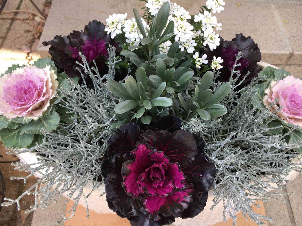 ハボタンの寄植えでもう一つ。こちらは楕円形の鉢を使ってブーケのようなイメージで💐