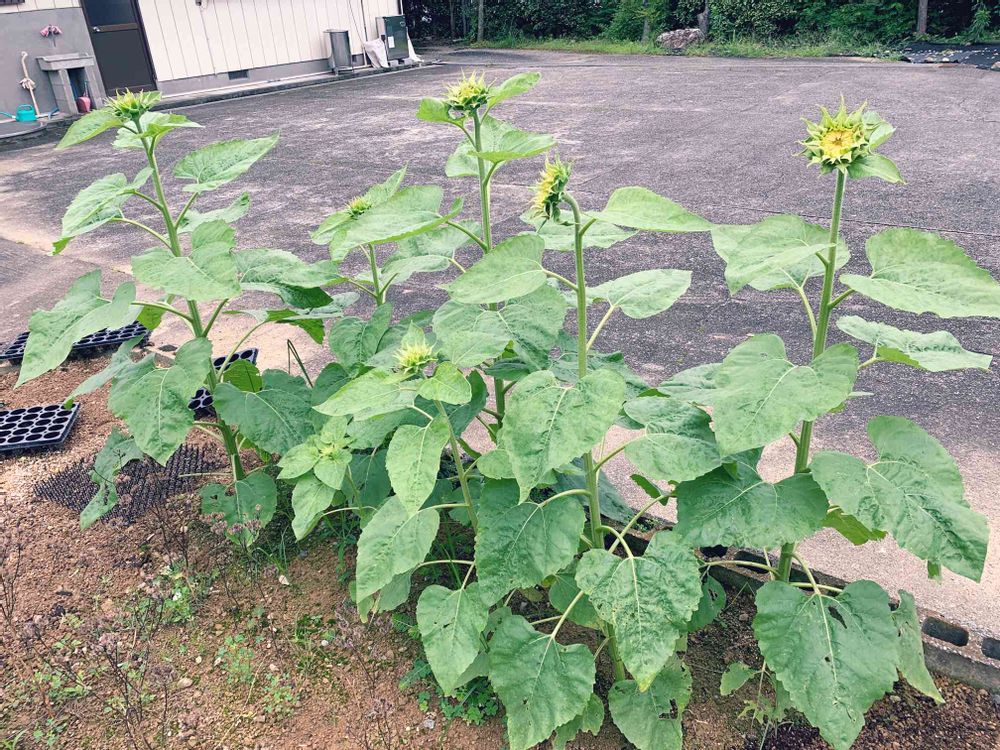 ひまわり3種、花の色の違いだけでなく、葉や茎の太さ、いろいろな違いが見られます😌