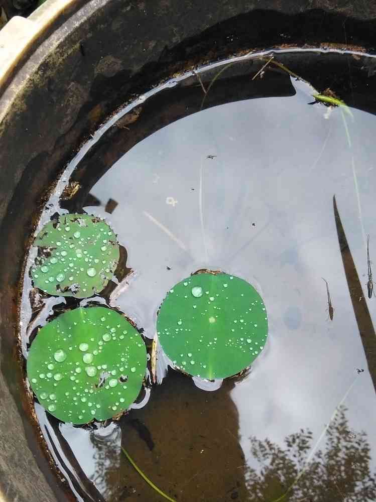 先日頂いた蓮を大きな樽に植えました。新芽もでてなんとか大丈夫そうです。古代蓮の里で手にいれたものだそうです。