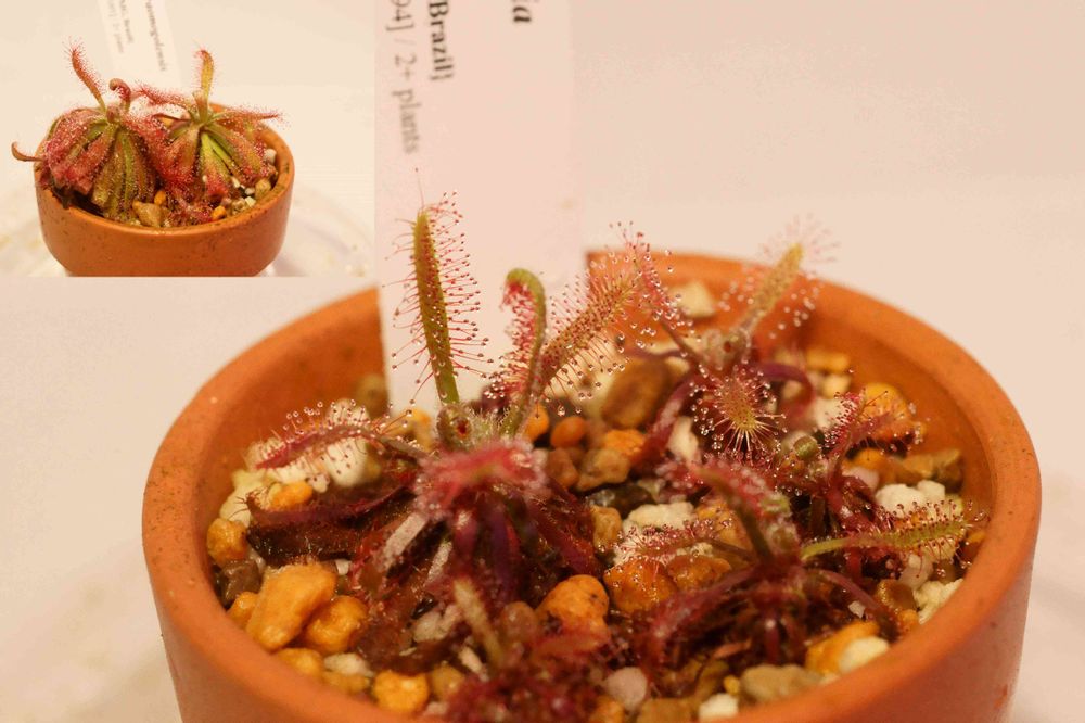 ついでのついでで、ドロセラ ラティフォリア(Drosera latifolia)、南米ブラジル南東部に自生している。左上は2週間ぐらい前に投稿したドロセラ グラオモゴレンシス(Drosera graomogolensis)。
