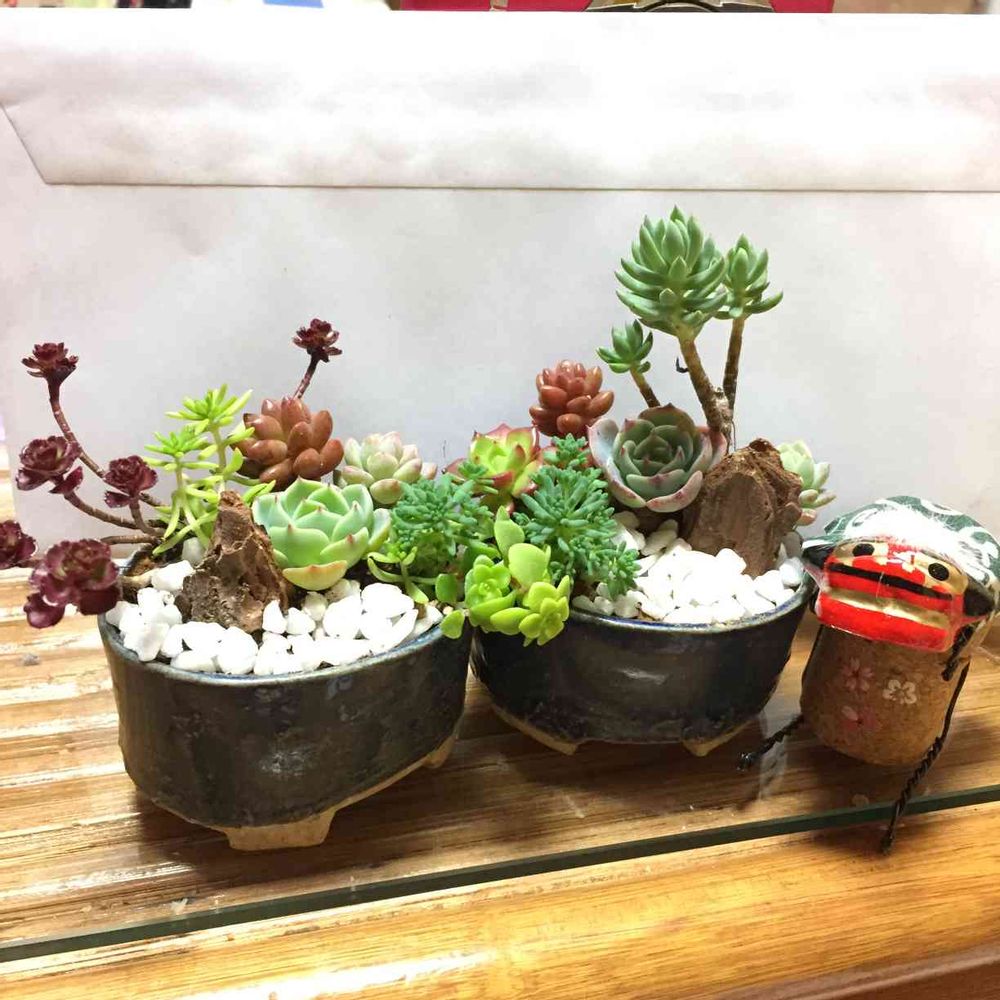 益子焼の器にミニ多肉の寄せ植えを作ってくれました。陶器なだけで何となく和のテイストが出ますね♪