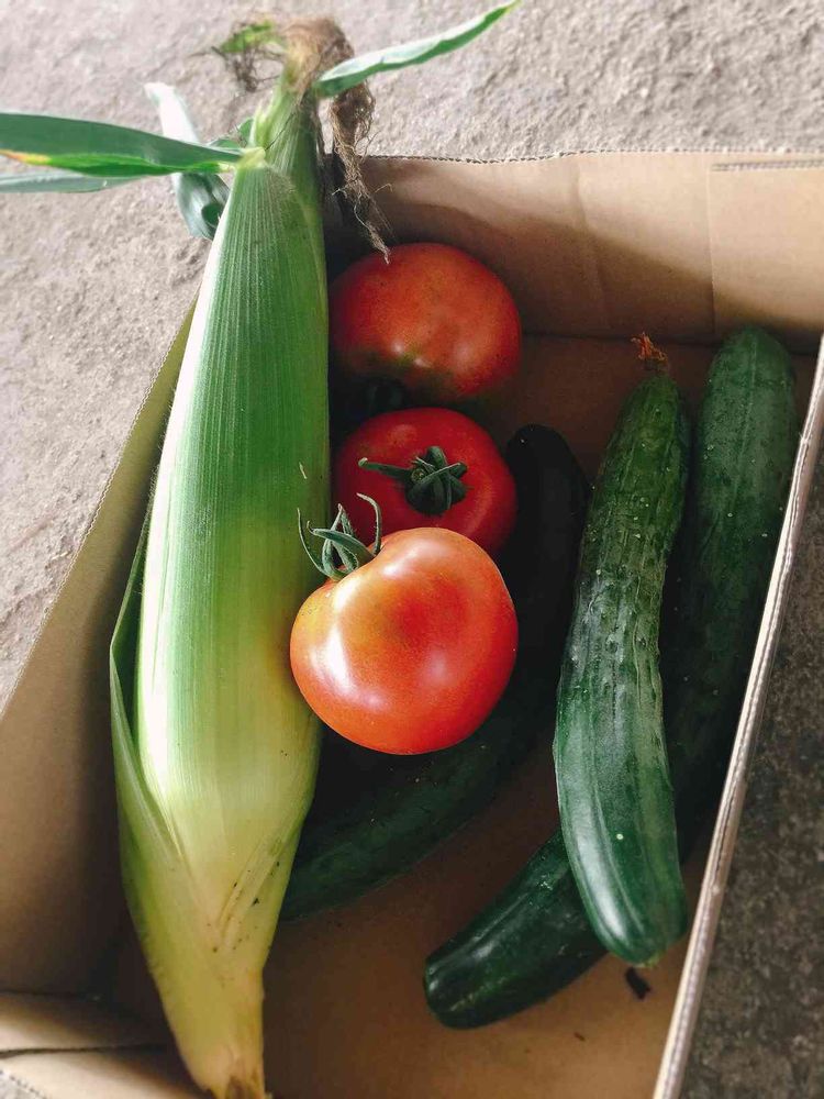 「トウモロコシある?トマトは?きゅうりは?」と問いかけながら捥いでくれました。