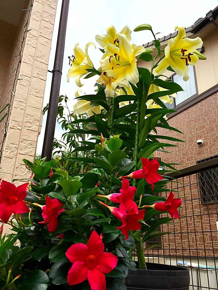 今年7月中玄関前で綺麗に咲いてくれた、ゴールデンカサブランカとサンパラソルマンデビラ赤。。。。。超嬉しい꒰ღ˘◡˘ற꒱❤⃛