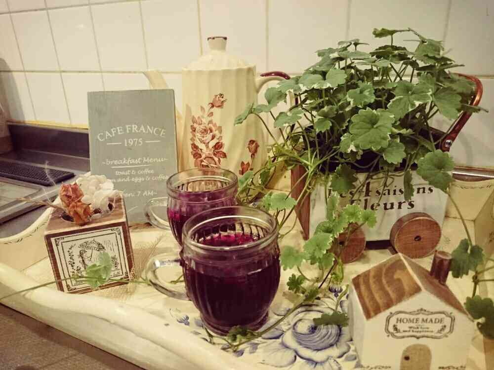 手押し車のたらりんグリーン見ながらシソジュースいただきます💜(*´▽`*)💜