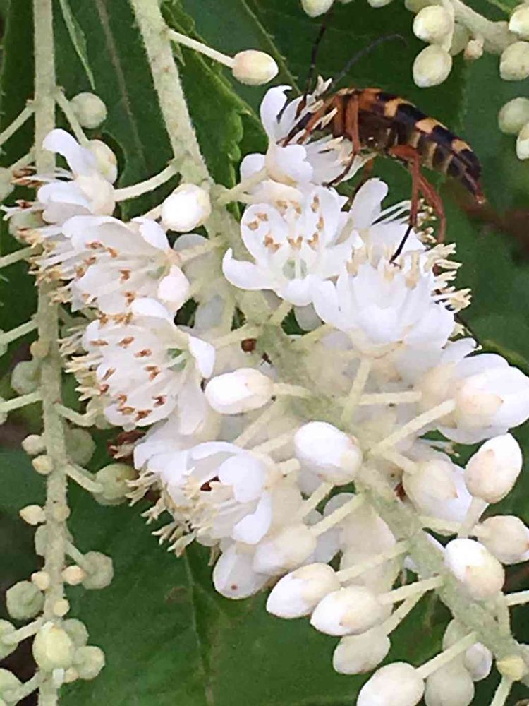 令法。山道に入って小暗くなるこの時節、樹木の花はめずらしい。白い花が総状花序となっているのですぐ目に付く。今回、リョウブの枝が垂れ下がって目の前にあったので、よく観察できた。
