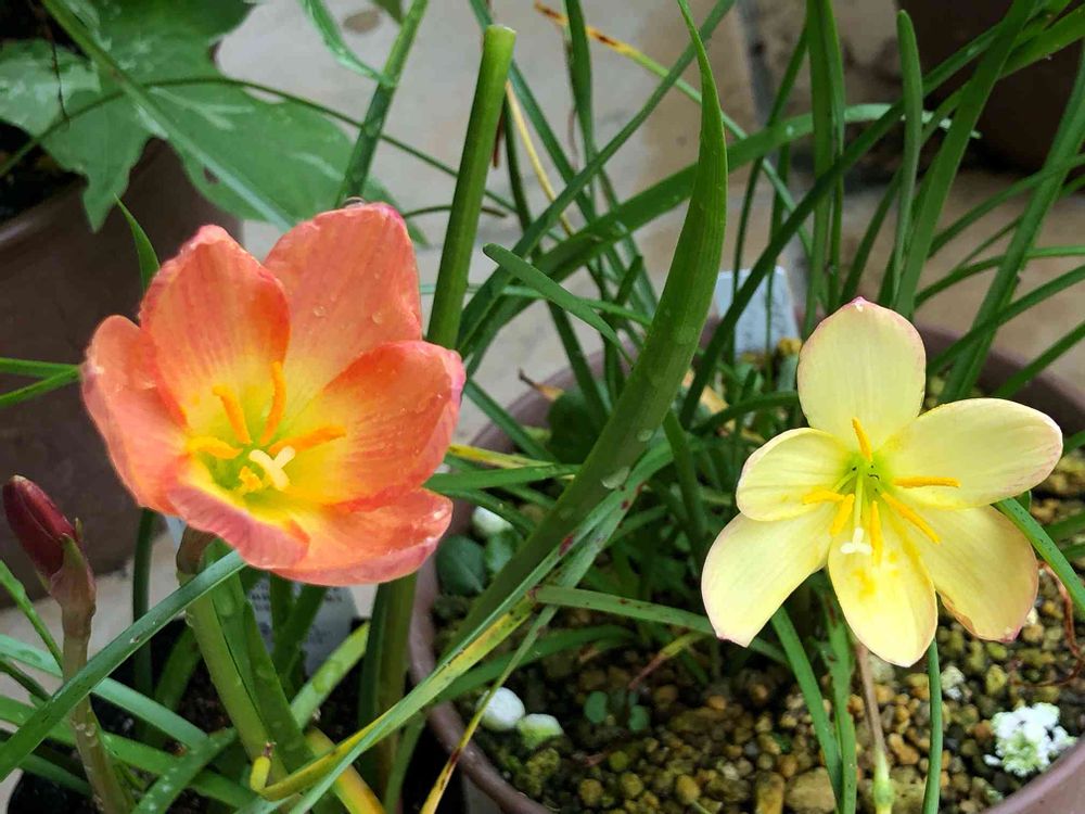 雨が降ると花が咲く事が多いのでレインリリーとも呼ばれるゼフィランセスです。左は先日、駅前の小さな花店から連れてきた‘オレンジカウンティー’、右の黄色は3年前から育てている‘キングス ランソムです。