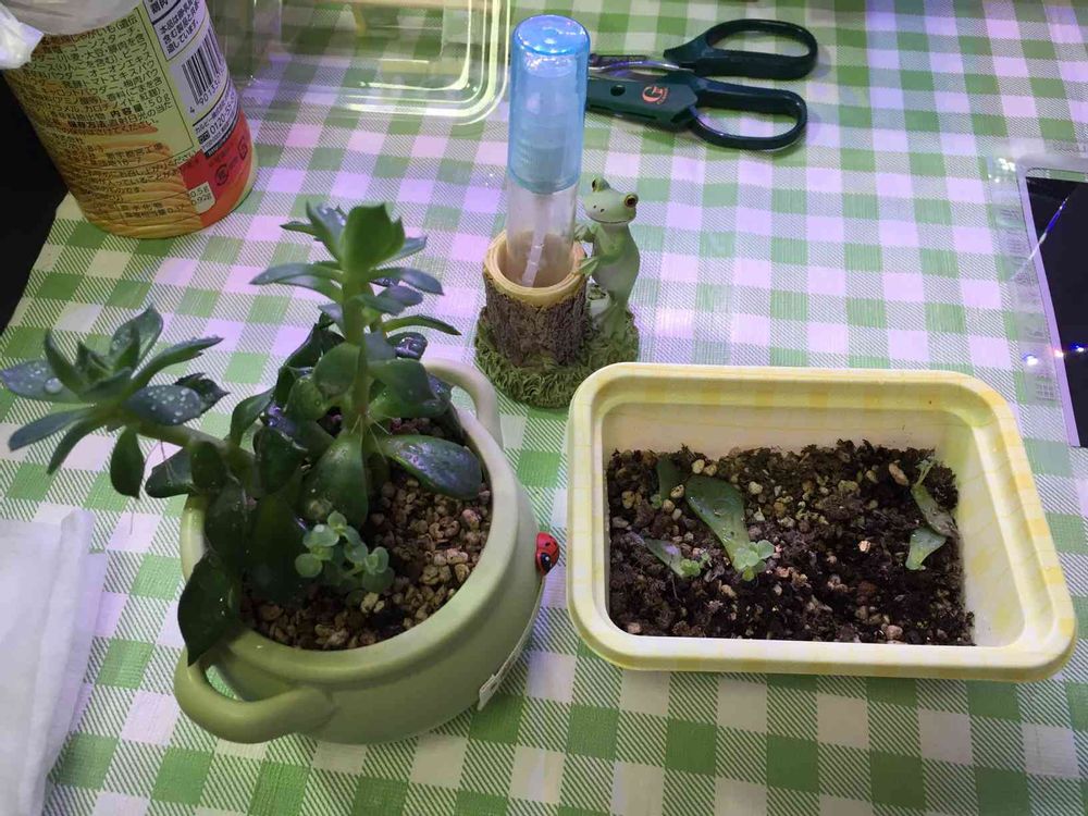 エケベリアの葉挿しした子達の中で、背の伸びた子を1人、親鉢に移動しました。