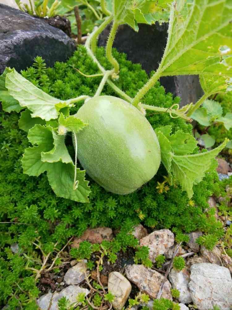 実つけ始めた時に地面に直だとダメだなってツル伸ばしたらちょうどセダムゾーンまで伸びたからこりゃ良いじゃん‼️😆っていい物件見つけてお引っ越し🤣