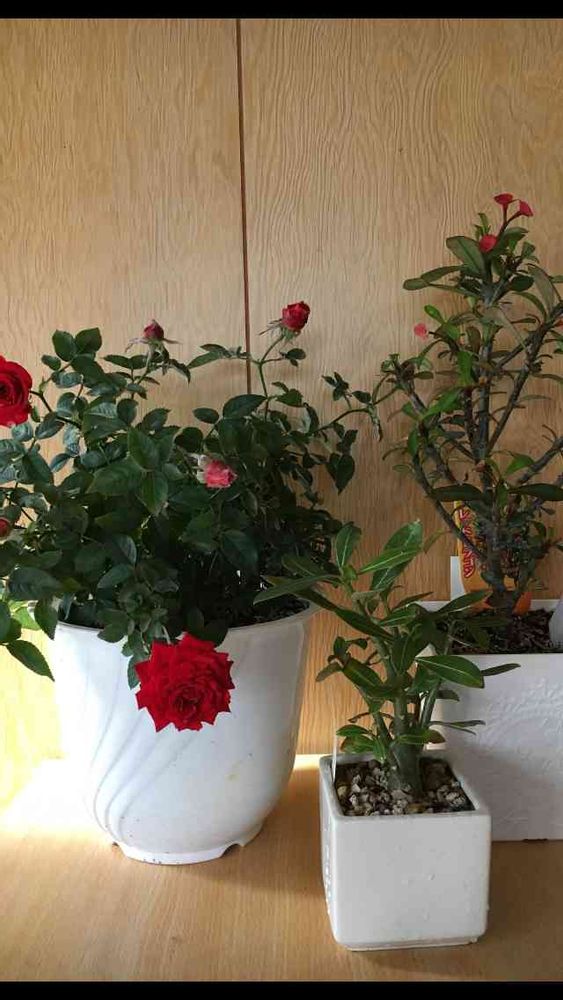 左からミニ薔薇、真ん中が、アデニウム、右がハナキリンです。