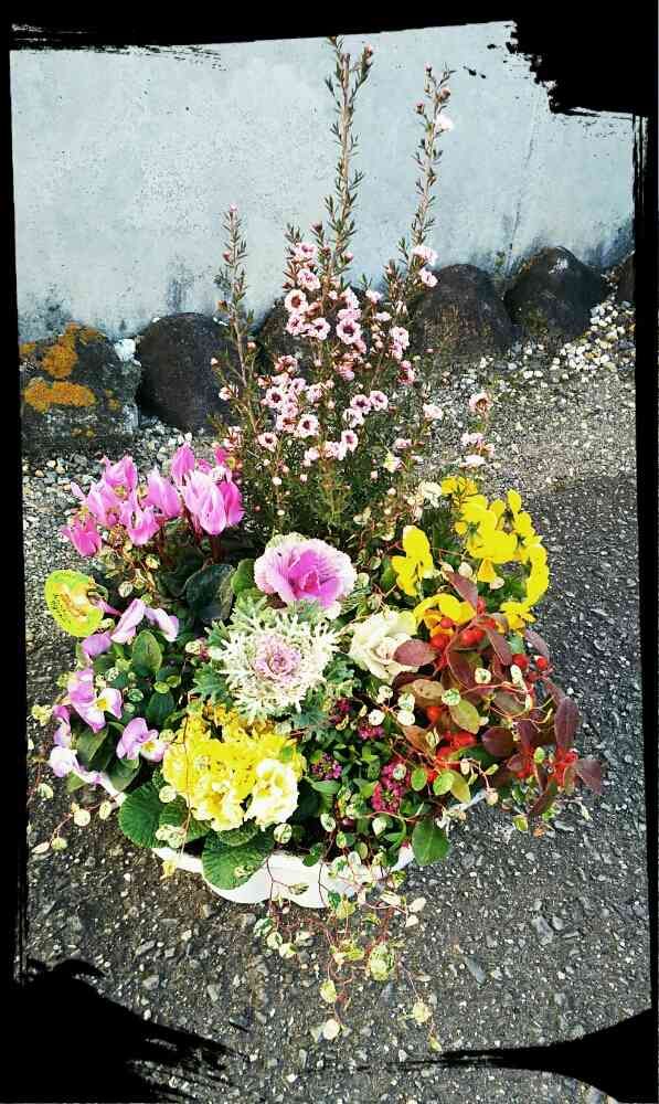 ギョリュウバイ、ガーデンシクラメン、パンジー、ジュリアン、チェッカーベリー、ビオラ×2、葉牡丹ラビアンローズ、アリッサム、ワイヤープランツスポットライト