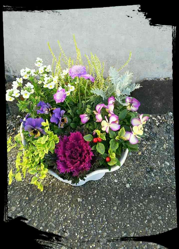 カルーナ、ネメシア、パンジー ×2、バコパ、ちりめん葉牡丹、ヤブコウジ、シルバーレース