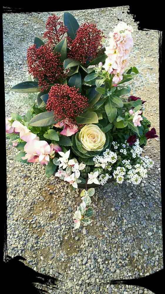 スキミアと葉牡丹を中心にした寄せ植え🌹by お店の奥さん作🎵