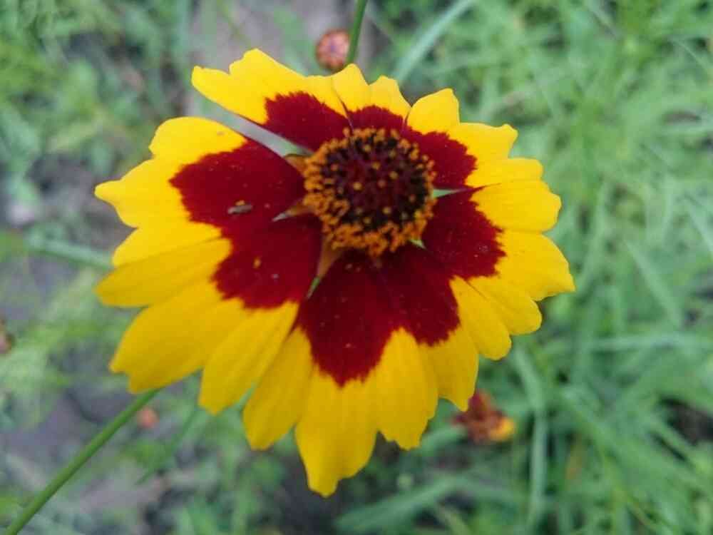 黄色と深紅色とのツウートンカラーの花を咲かせています。雑草に混ざっています。種がどこからか飛んで来たのでしょう⁉ 🍀 宜しく願います。