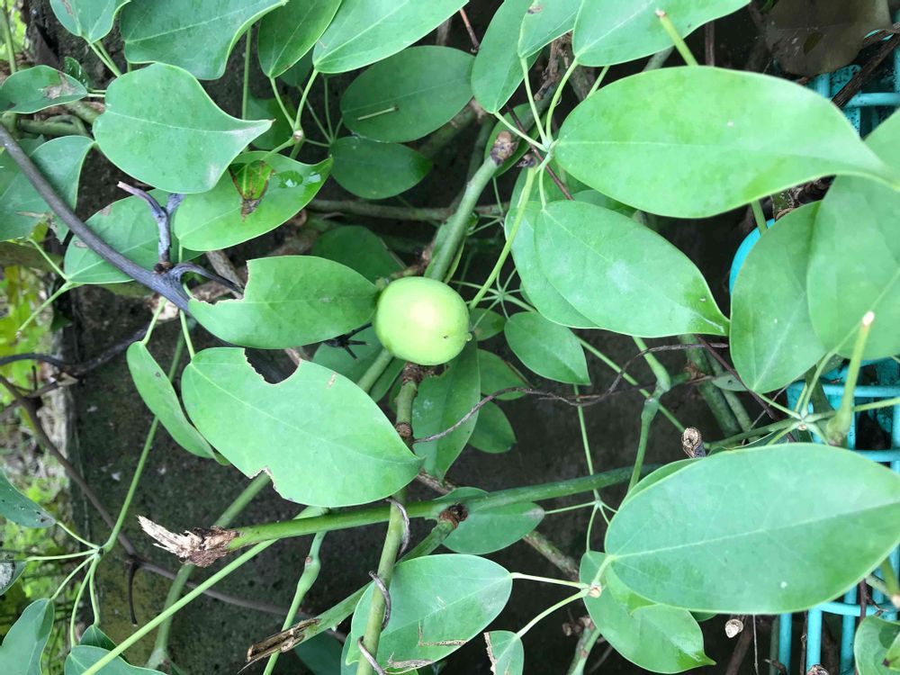 ちょっと自信ないですが、「ムベ」かもしれないです。うちにあるのに葉っぱが似てます。実はアケビみたいなやつです。アケビみたいに裂けませんが。